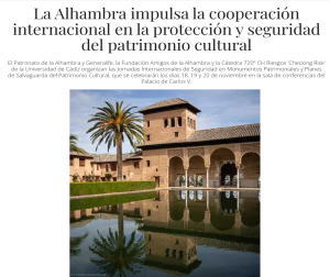 | La Cátedra 720º CH Riesgos “Checking Risk” de la Universidad de Cádiz y la Fundación Amigos de la Alhambra han organizado las “I Jornadas Internacionales en Seguridad en Monumentos Patrimoniales”, en las que colabora la Sección de Cádiz del Instituto Andaluz Interuniversitario de Criminología, que tendrán lugar los días 18 y 19 de noviembre en la Sala de conferencias del Palacio de Carlos V.